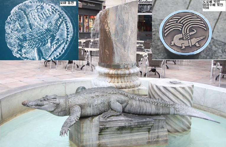 크지 않은 님(Nimes)의 마르세 광장에는 야자나무가 심어져 있고 분수에는 쇠사슬에 묶인 악어