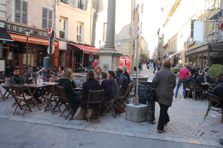 전형적인 남프랑스 중세 도시 모습은 도심의 중심에 분수가 있는 광장과 성당이 있다. 그 광장 가까이에는 옷, 식품 등 생필품을 파는 상가들이 모여 있어 시장 구실을 하고 Cafe나 식당, 기념품 가게나 갤러리, 아틀리에가 있다. 담장이 없이 붙어 있는 건물들은 3층~5층 경우 1층은 가게들이 차지하고 그 상부는 주택이었다.