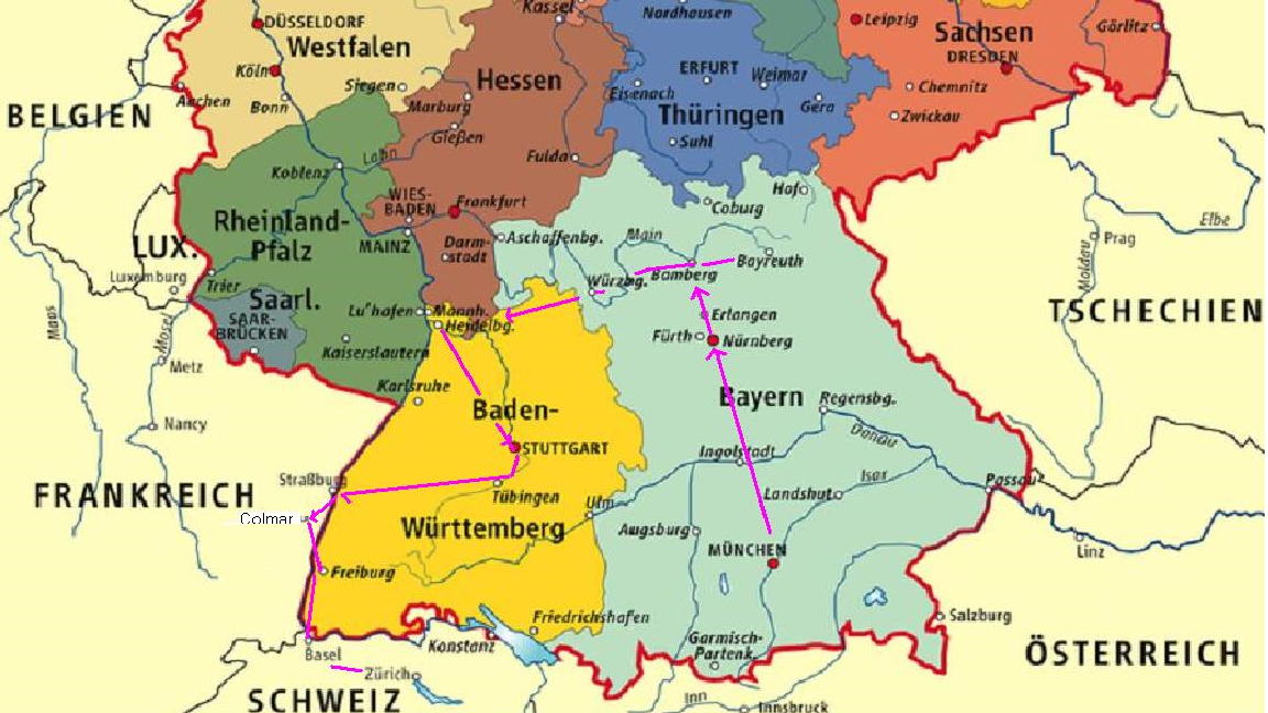 나의 바이에른 북부 루트: 뉘른베르크-밤베르크-바이로이트-뷔르츠 부르크-로텐부르크-하이델베르크-슈투트가르트-호엔촐레른성-(프)스트라세부르-(프)꼴마흐-(독)프라이부르크-(스)바젤-(스)취리히-(스)루체른