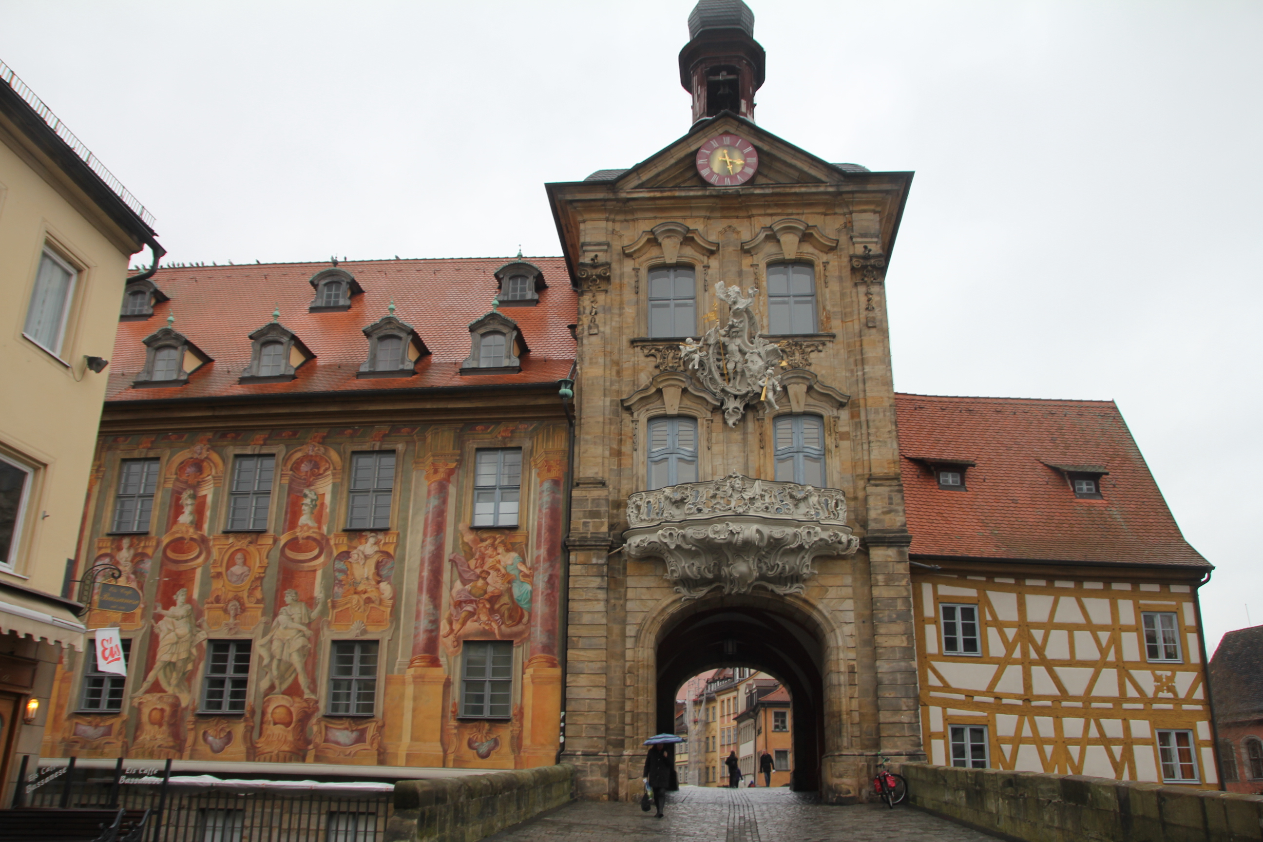 밤베르크 시청사(市廳舍)는 강을 건너는 다리 위에 지어져 있는데, 화려한 벽화 장식과 비