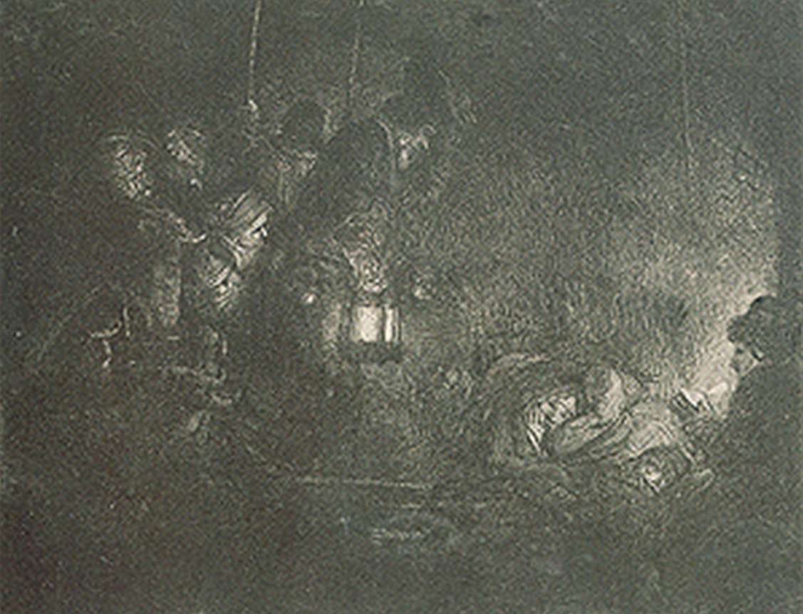 그의 또 다른 판화 <목자들의 경배>(에칭, 드라이포인트, 1652)는 들판에서 천사에게 기쁜