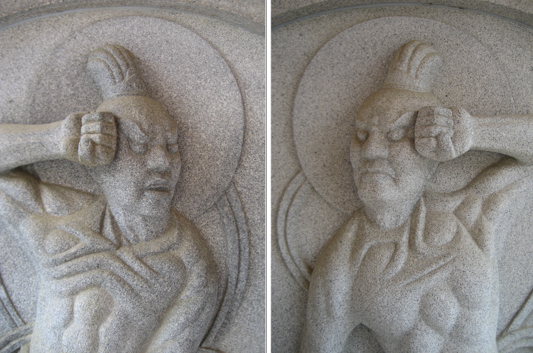 한편 예술적 아름다움을 추구하기 위함이 개입되어 있었는지는 모르지만, 사상이나 종교적 이유로 건축물이나 조각 작품에서 좌, 우 대칭의 모습이 아닌 변용(變容)을 만나는 경우도 있다. 일예로 석굴암 전실(前室) 좌우에 조각되어 있는 금강역사(金剛力士)는 예술적 고려보다는 종교적 상징으로 서로 다른 모습으로 조각되었을 것이다. 금강역사는 인왕역사(仁王力士)라고도 하며, 입을 벌리고 오른쪽을 지키는 분이 나라연금강(那羅延金剛), 입을 다물고 왼쪽을 지키는 분이 밀적금강(密蹟金剛)이다. 위의 금강역사 사진들은 석굴암의 금강역사를 모작한 작품으로 법주사의 대불 아래에 조각되어 있는 것이다.