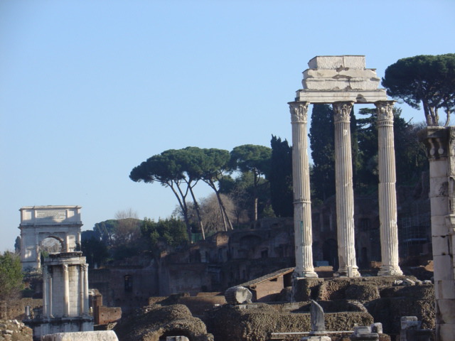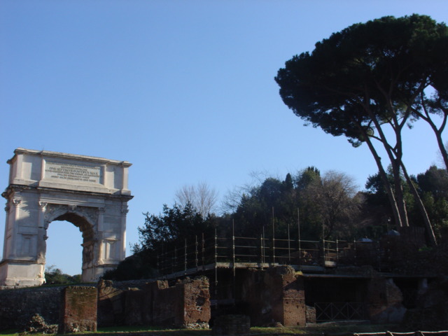 콜로세움 옆에 있는 콘스탄티누스 대제 개선문을 지나 포로 로마노로 들어갔다. 포로 로마노는 ‘로마 광장의 뜻’으로 고대 로마의 정치, 사법, 상업, 종교 활동의 중심지로 화려했던 고대 로마의 배꼽이자 노란 자위 터이다. 실제 ‘로마의 배꼽(UMBILICUS URBIS ROMAE)’이란 돌 판이 벽에 붙어 있다. 하지만, 지금의 모습은 흙먼지가 날리는 그야말로 황성 옛터의 모습이다. 포로 로마노 내부에는 아직도 발굴 중인 모습을 볼 수 있고, 비포장된 길 옆엔 유적지가 그대로 방치되어 있는 곳도 있었다.