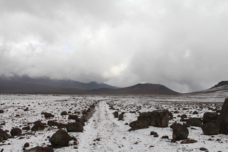 Horombo팀이 하산하기 시작했던 고산 사막 지대는 자갈돌과 흙길이었지만 진눈깨비가 내려 먼지는 날리지 않았으며, 고도가 낮아질수록 날씨가 개었고 고산증세도 덜해졌다.