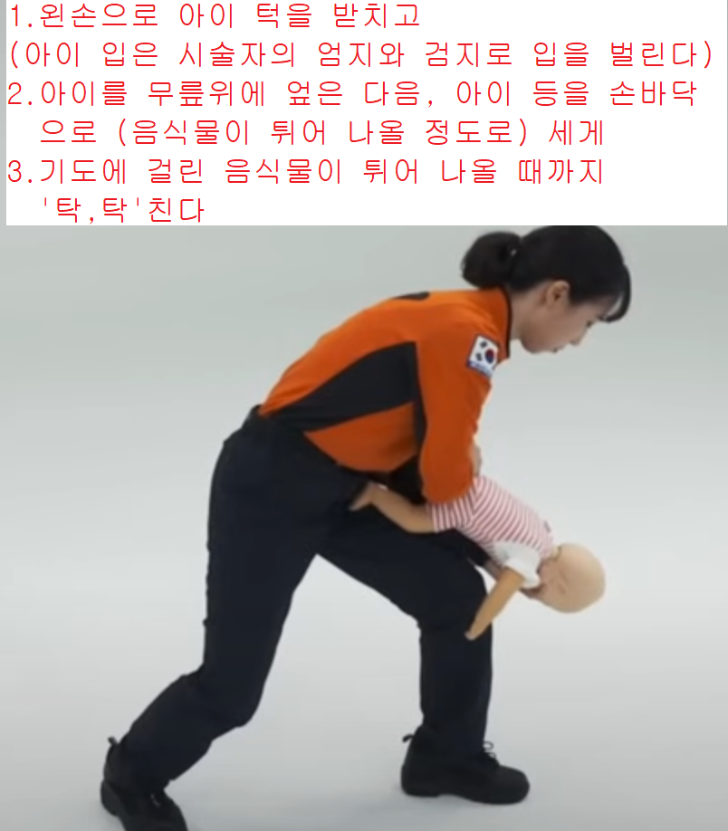 (시술자의 엄지와 검지로 아이 입을 벌린다 .-이물질이 쉽게 나오게) 2.아이를 무릎 위에 엎은 다음, 아이 등을 손바닥으로 5번 정도(음식물이 튀어 나올 정도로) 연속적으로 세게 '탁,탁' 친다. 3.기도에 걸린 음식물이 튀어 나올 때까지 '탁,탁'친다 |