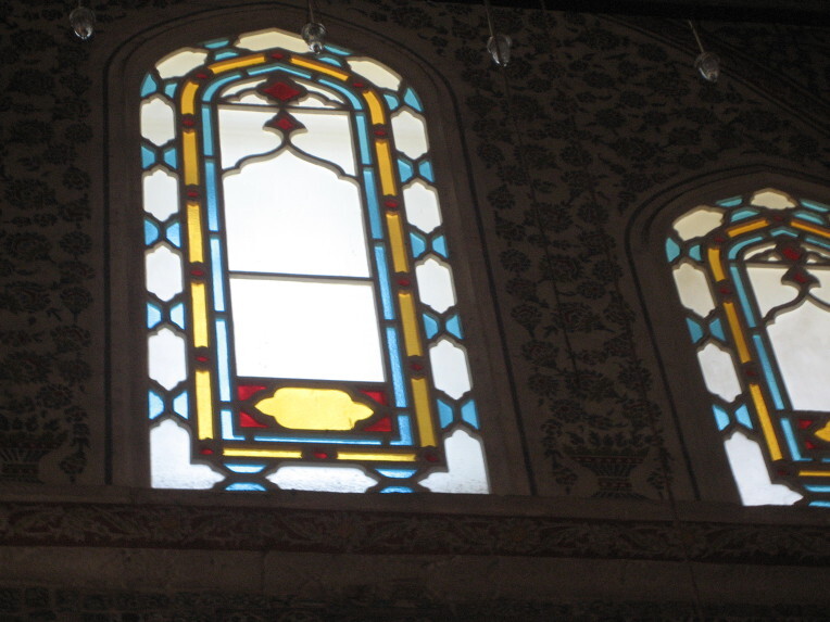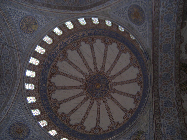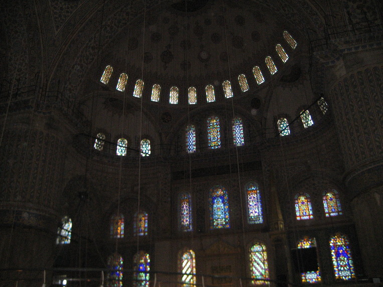 '블루 모스크'의 다른 별칭은 '술탄 아흐멧 사원(Sultan Ahmet Mosque)'인데, 성스러운 곳이라 신을 벗고 들어가야 한다. 블루 모스크의 내부에는 200개가 넘는 창이 스테인드글라스로 장식되어 있어 이를 통해 들어오는 형형색색의 빛살이 내부에 무지개색을 드리운다. 스테인드글라스에 비쳐 나오는 빛과 흰색 푸른색의 타일들이 내부의 장식들과 어우러진 환상적인 모습은 만화경을 들여다보는 듯 아름답고 오색영롱하다는 말 외는 달리 표현할 수가 없다. 무슬림(Moslem 모슬렘)들의 나지막한 코란 암송 소리는 이곳이 바로 천상 세계라 말하는 듯하였다.