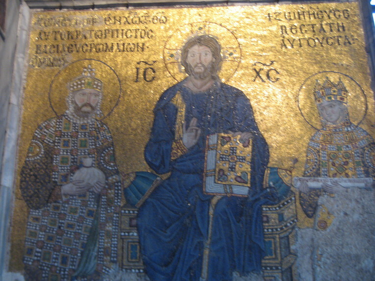 그리스도에게 이 성당을 헌납한다는 의미의 모자이크 벽화는 벽이 온톤 금 투성이다. 오른쪽은 여황제였던 ‘조에’로 젊었을 때 모습으로 표현되었고, 왼쪽은 3번째 남편으로 남편이 바뀔 때마다 그림이 수정되었다 한다.