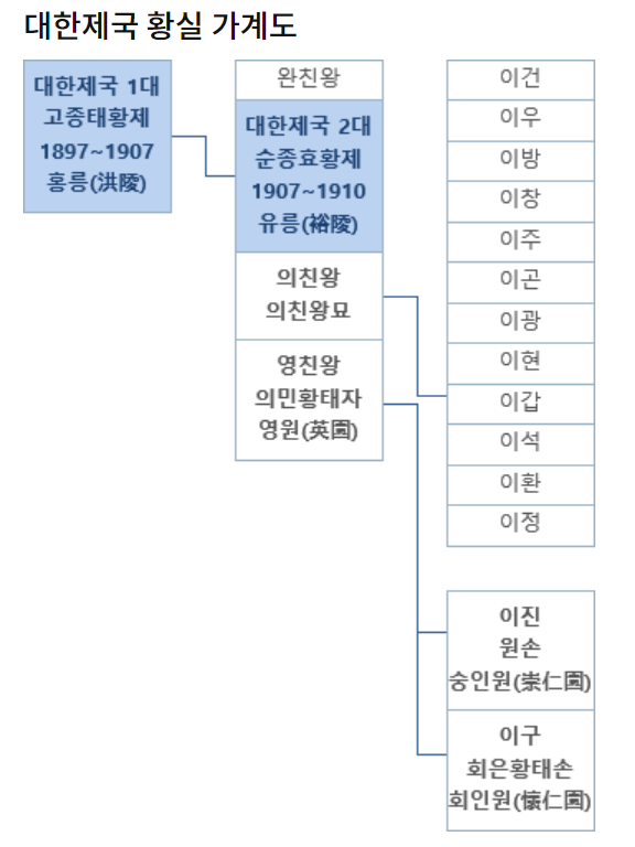 1897년에 대한제국으로 전환되며 왕실의 지위가 황실로 격상되어 왕을 황제, 왕비를 황후, 왕세자를 황태자, 왕세자빈을 황태자비, 왕자를 친왕이라 하였다.